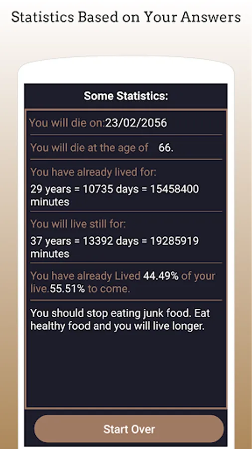 In addition to the death date prediction, you will also get some statistics and tips regarding your life, eg. amount of days/minutes already lived, how many days/minutes you will still live for.