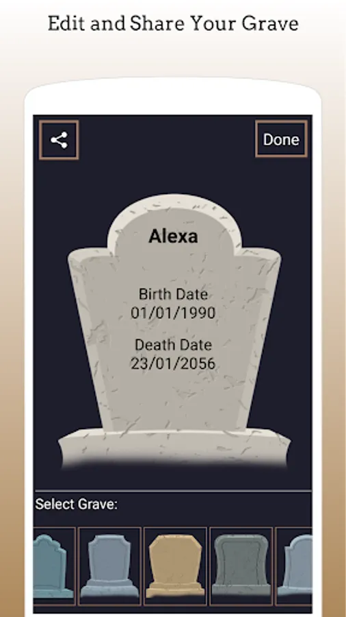 Death Date Calculator & Grave Editor App that calculates when you will die and gives Free Life Prediction and suggestion on the basis of your health status height weight and life style.