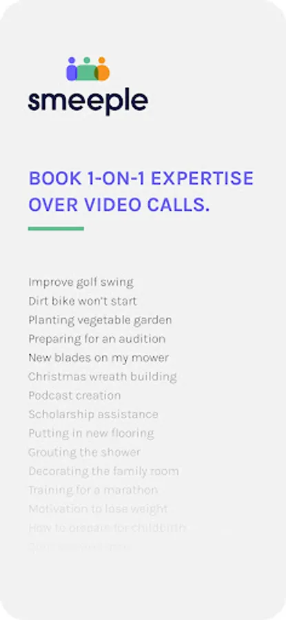Say goodbye to generic online answers and hello to personalized solutions with Smeeple. Our innovative app allows you to search for and connect with subject matter experts (SMEs) in a variety of topics, including DIY, education, sports, and more.