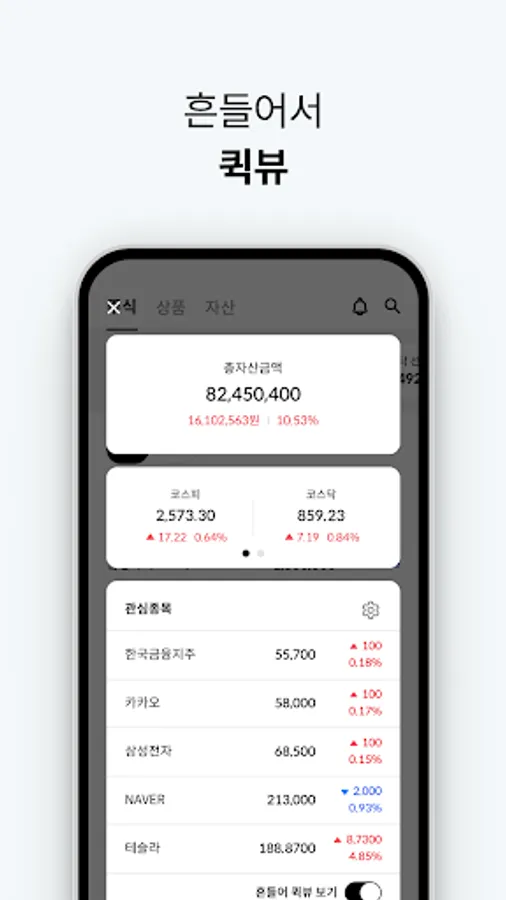 • Shake the app at any time and use [Quick View] to see the status of your assets and items of interest.