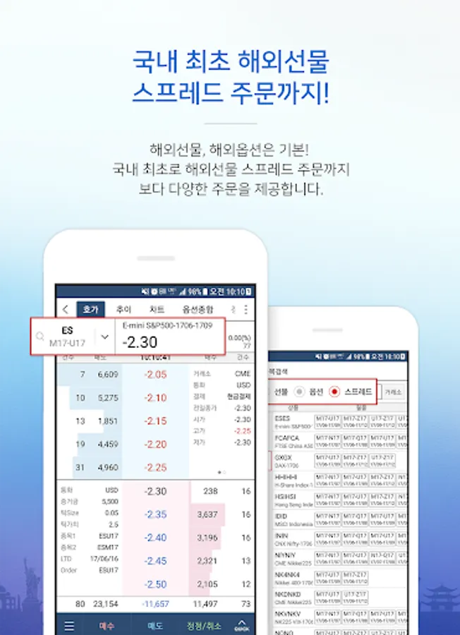 - Various overseas futures trading available: VIX futures (S&P500, EuroStoxx50 volatility index), Taiwan index futures, and Korea’s first overseas futures spread orders can be traded on your smartphone.