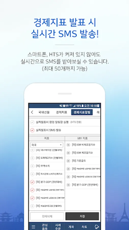 - Send SMS in real time when economic indicators are announced. You can receive SMS in real time even if your smartphone or HTS is not turned on.