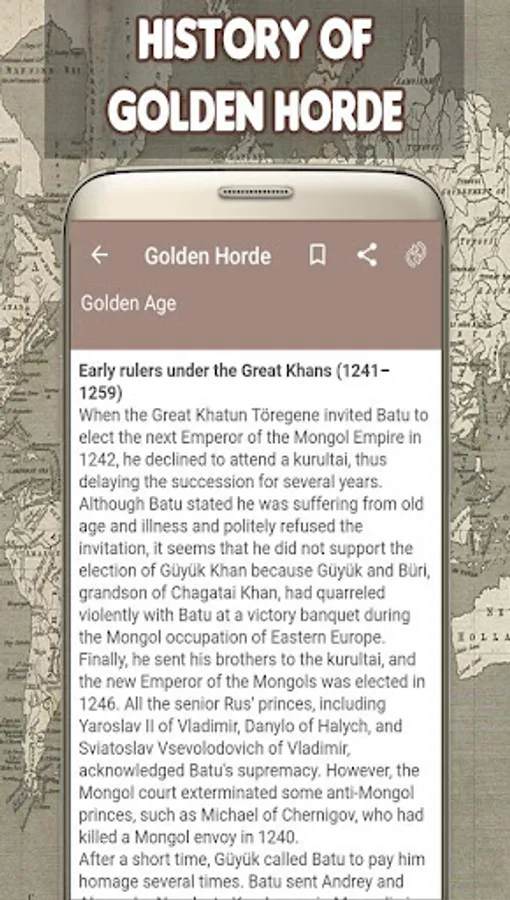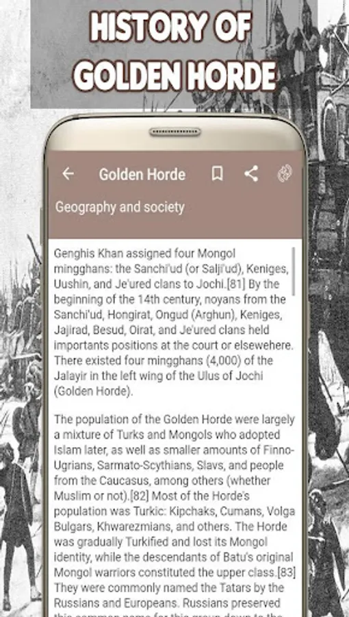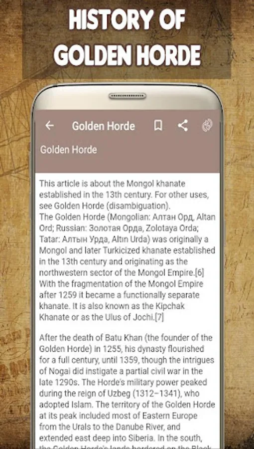 This app has a feature to mark any history page as bookmark with the History of Golden Horde. You can even select to view or browse or zoom whole content. We are sure that this app is better than other “Golden Horde History” app.