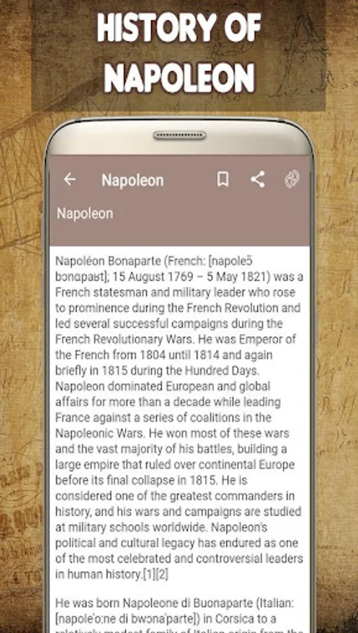 Beautiful “History of Napoleon" for all citizens of Napoleon! – ancient Napoleon history with Graphics - Popular Top "Napoleon history" Free Download! This is a whole app is very easy to use. The app cover whole topics related to Napoleon timeline, Napoleon facts, and American history.