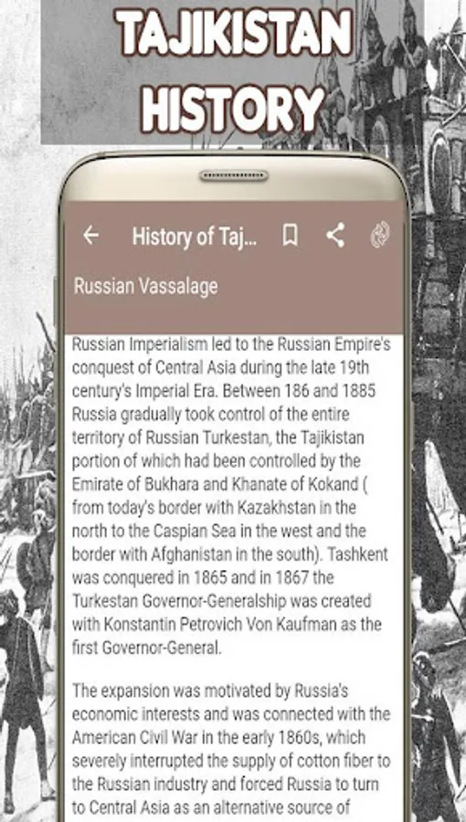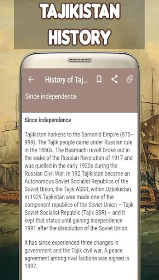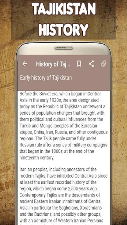 Beautiful “History of Tajikistan” for all citizens of Tajikistan! – ancient Tajikistan history with Graphics - Popular Top “Tajikistan history” Free Download! This is a whole app is very easy to use. The app cover whole Tajikistan history from Early history to independence.