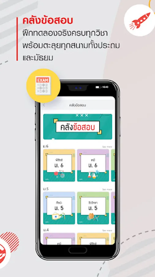 - คลังข้อสอบ และ คลังบทเรียน ให้ดูคลิปติว ทำแบบทดสอบกันฟรีๆ ครบทุกเรื่อง ทุกระดับชั้น