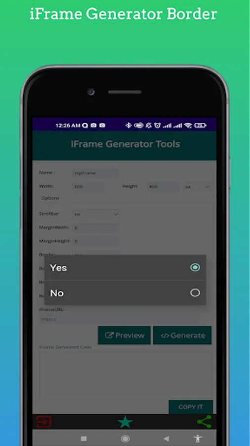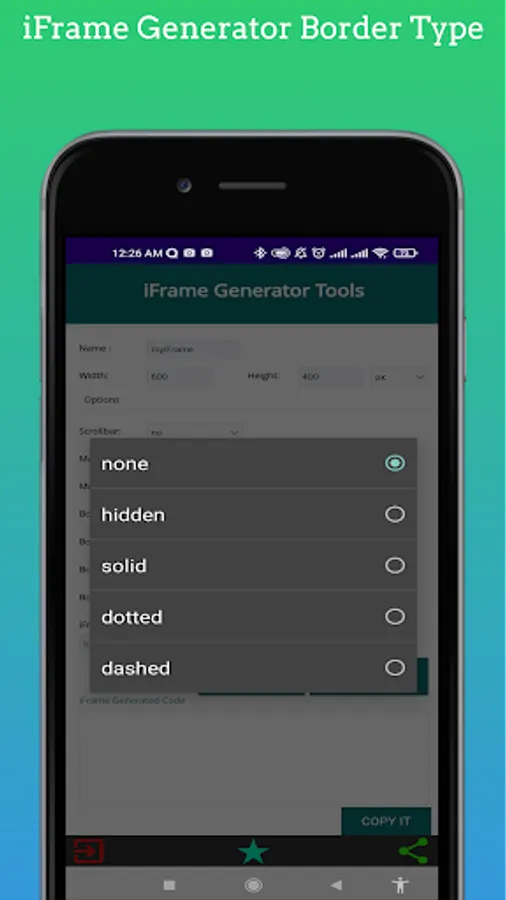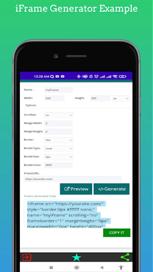 In this iframe generator, you can change the width, height, margin width, margin height of the iframe, you can also disable and enable border, you can change border type to none, hidden, solid, dotted, dashed, border size, and also you can change the border color and also make iframe responsive.