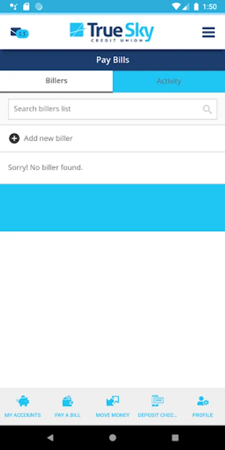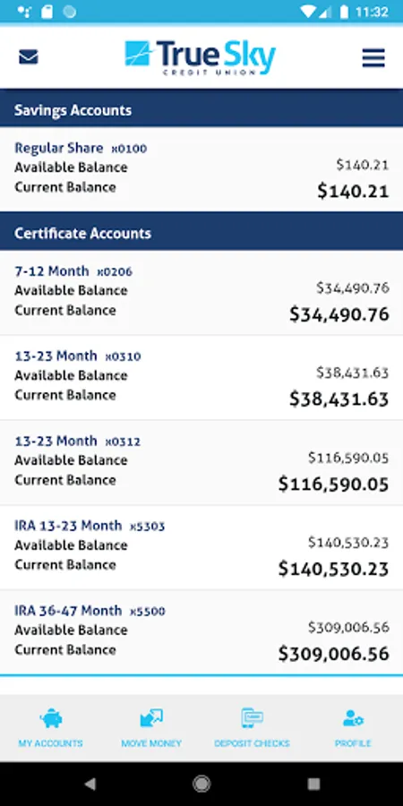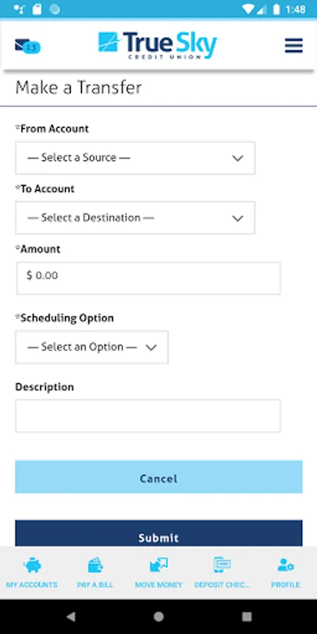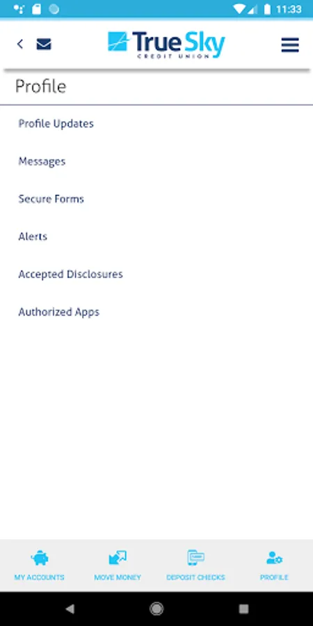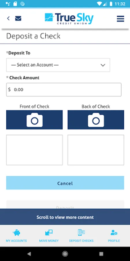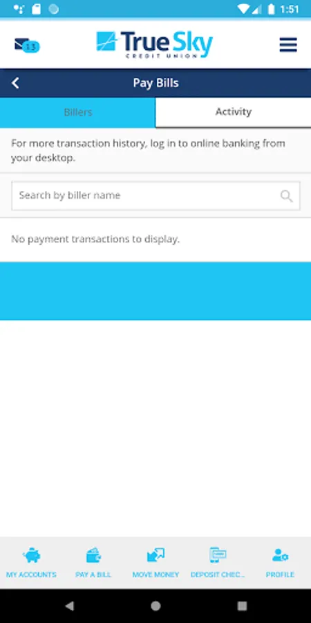 With True Sky Credit Union's new mobile app, you can view account balances, transaction history, transfer funds, pay bills, find branches, and deposit checks remotely.