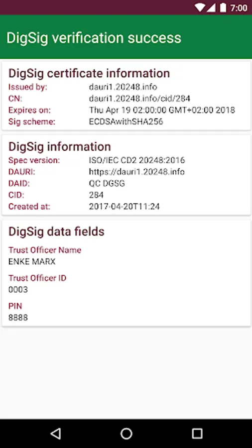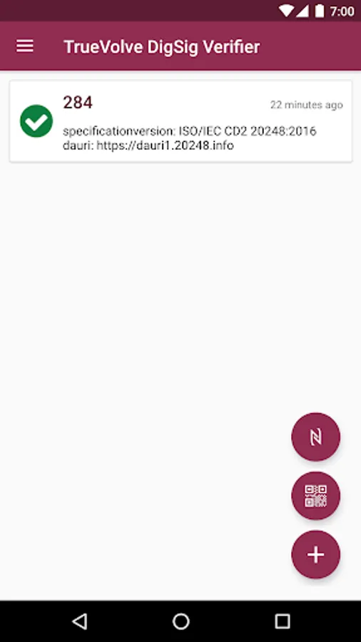 The TrueVolve DigSig verifier is an ISO/IEC 20248 verification device, which verifies DigSig QR, NFC and DataMatrix. Verification of DigSigs happens offline, once the correct keys are fetched. Information is displayed in a material design layout.
