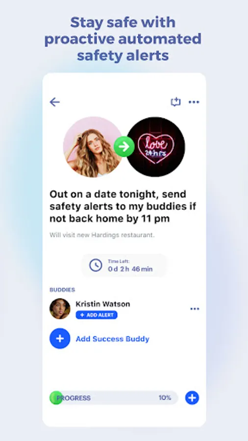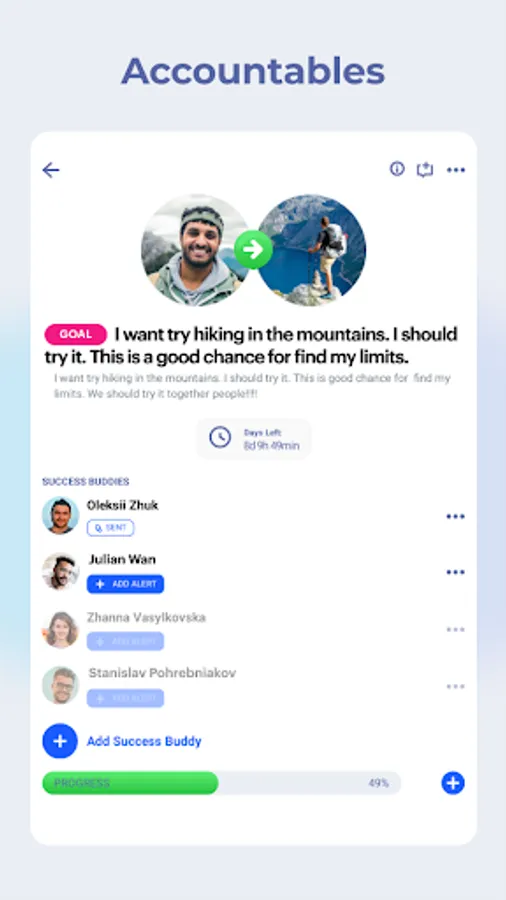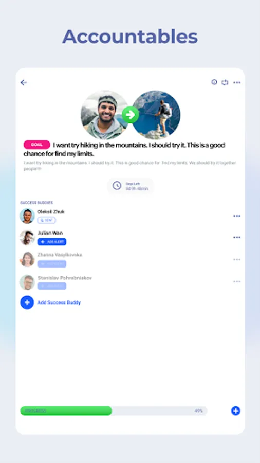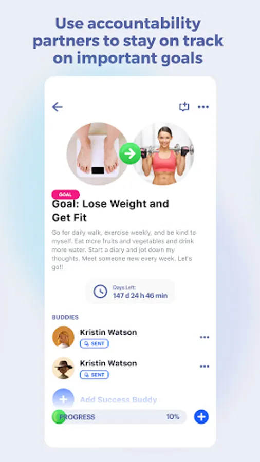 - Dynamic and intelligent progress bar that tracks your goals progress and can be set to alert you and your accountability buddies when you fall behind.