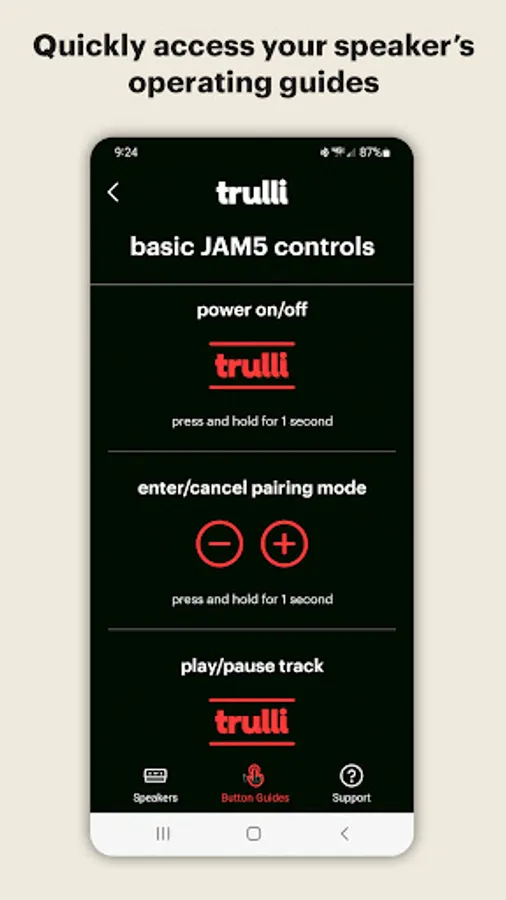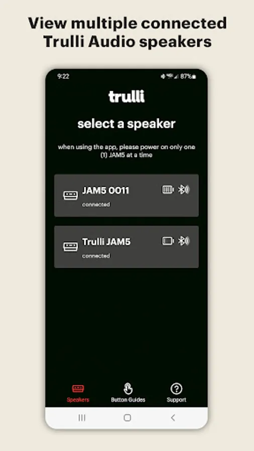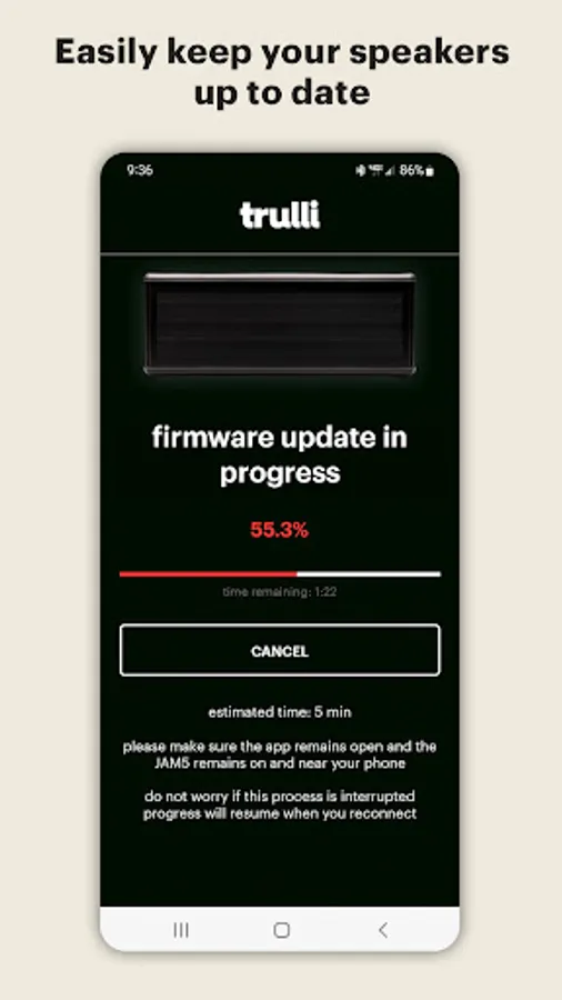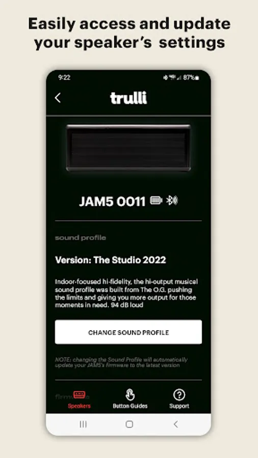 The Trulli Audio app is the only way to update your JAM5 speaker and maximize the full potential of your listening experience. The app also allows you to update the firmware of your JAM5 speaker, improving performance & fixing minor bugs.