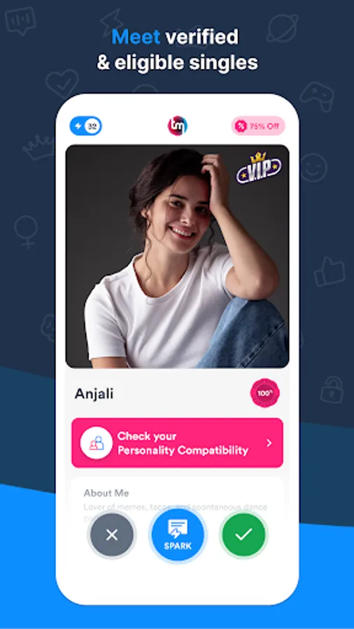 💯 Trust Score: Our dating and matchmaking app aims at keeping our platform free from fake profiles. Increase your matches on the TrulyMadly Indian Dating app by increasing your Trust Score by verifying your profile with Facebook, LinkedIn, contact number, photo ID, etc.