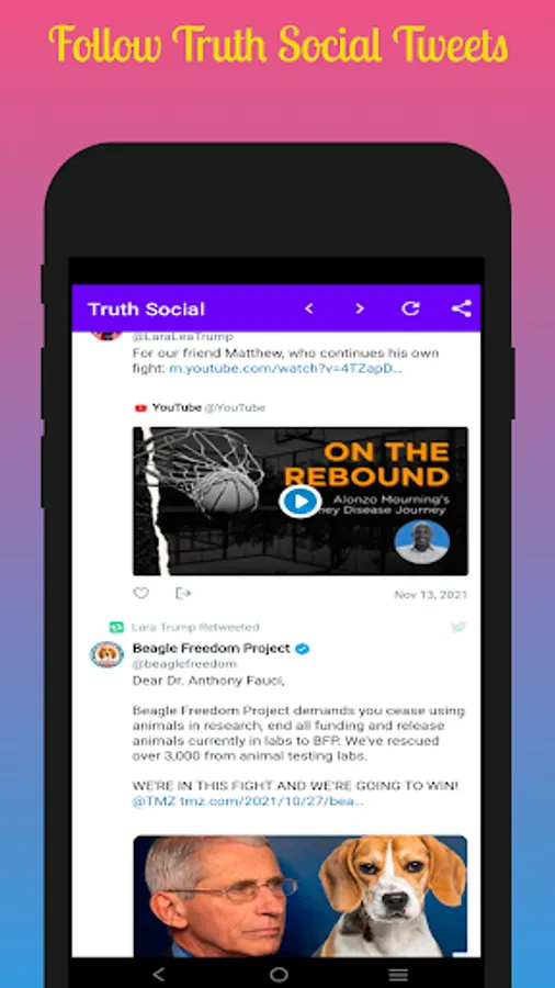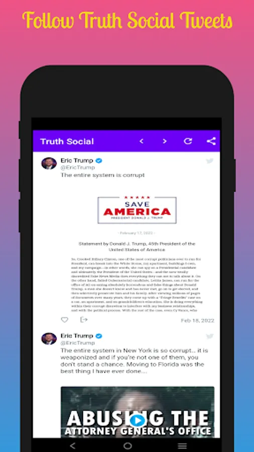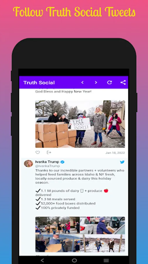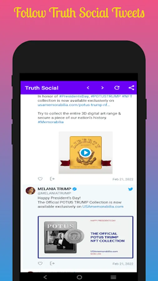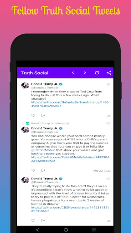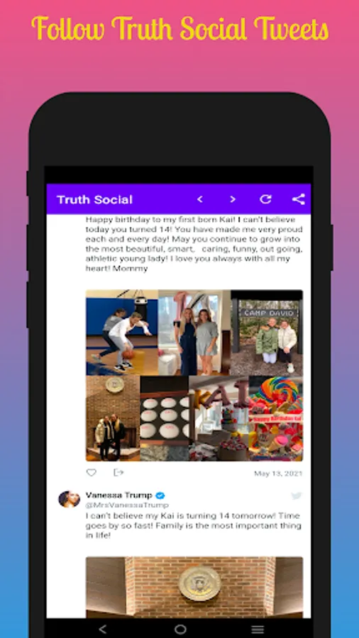 Using Trump Tweets app we can read tweets of Ivanka TrumpTweets, and Melania Trump Tweets. Donald John Trump Jr. Tweets, Eric Frederick Trump Tweets, Tiffany Ariana Trump Tweets, Lara Trump Tweets, Vanessa Trump Tweets and we can stay up to date with this app