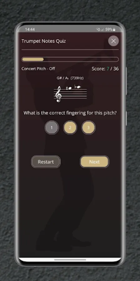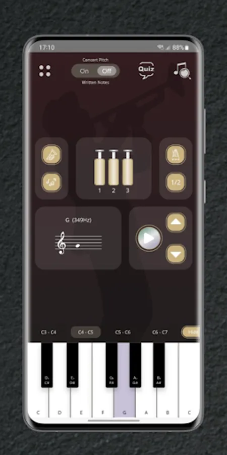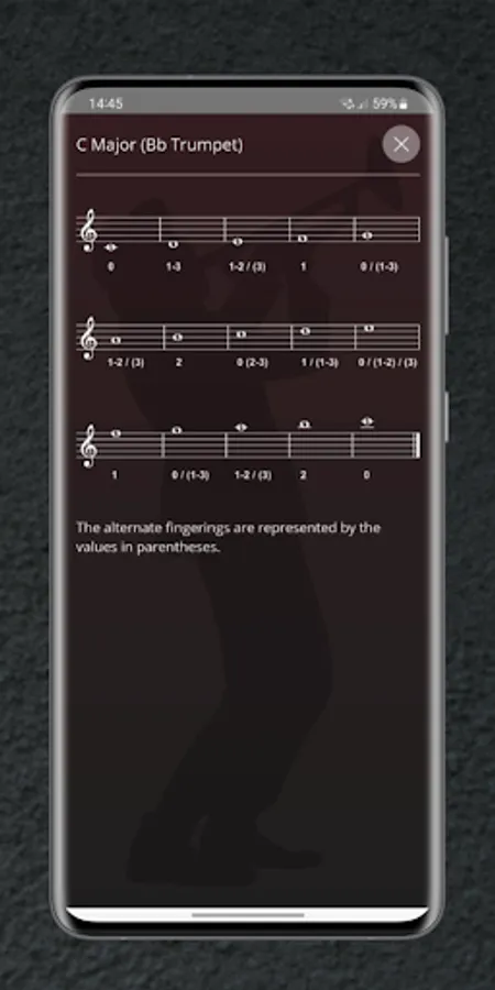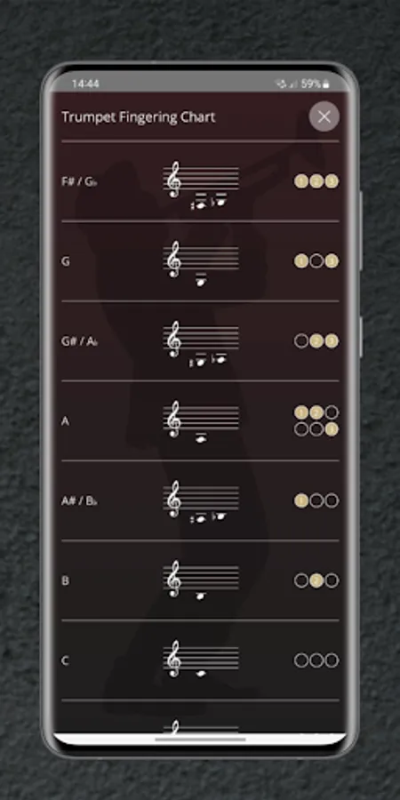 To help users get started, an onboarding guide is provided that explains how to use the trumpet fingering chart. Additionally, users can study trumpet notes through a quiz.