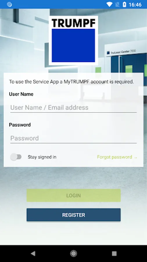 In order to use the app a free account for our customer portal MyTRUMPF is necessary. You can easily register for MyTRUMPF in the app after downloading it.
