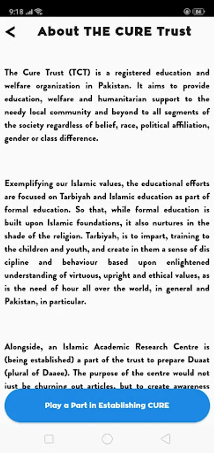 The Cure Trust (TCT) is a registered education and welfare organization in Pakistan. It aims to provide education, welfare and humanitarian support to the needy local community and beyond to all segments of the society regardless of belief, race, political affiliation, gender or class difference.