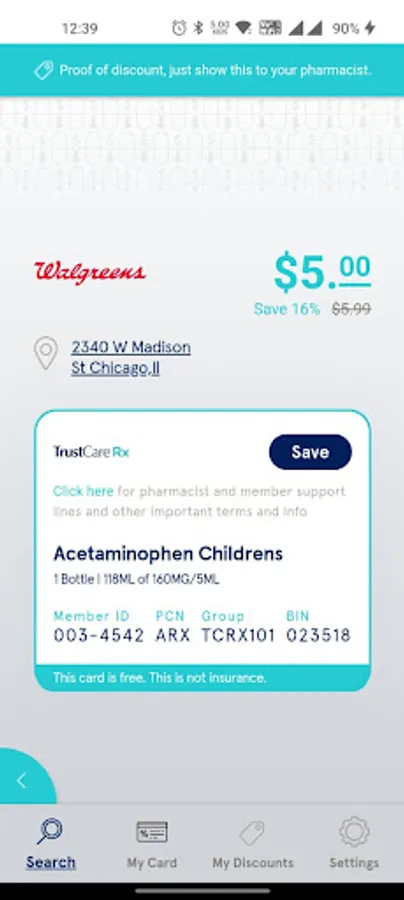 "The free TrustCare Rx app allows you to save up to 80% on brand and generic prescriptions at all major retail pharmacies including CVS, Wal-Mart, Walgreen, Rite Aid, Target, Kroger, Duane Reade and many more! TrustCare Rx helps you find the best possible deal based on your location because different pharmacies have different prices. Simply download the app, search for your medication and add the discount card to the """"My Discounts” section. To receive your discount, present your card to the pharmacist at the time of purchase.