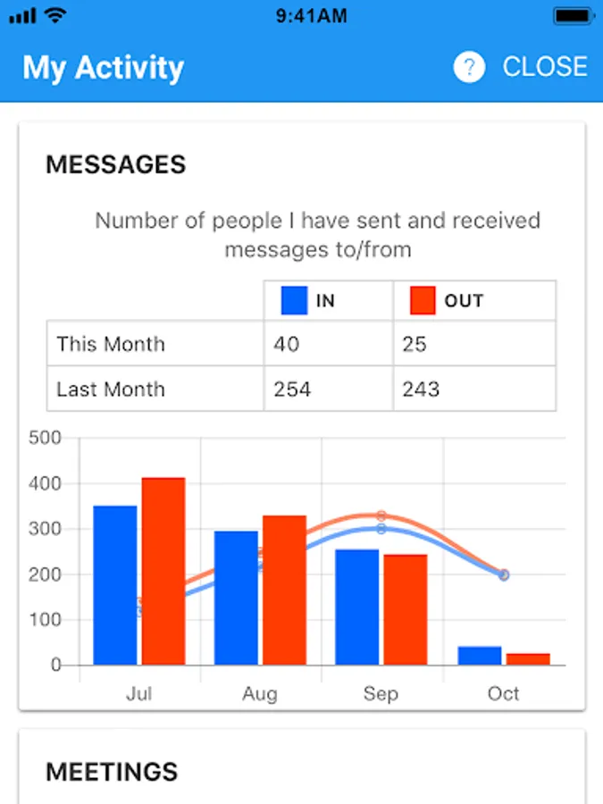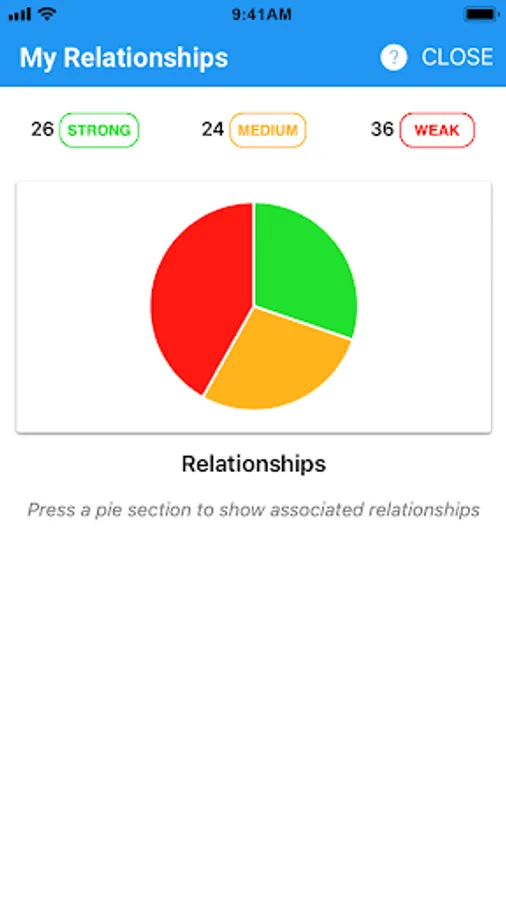 On the home screen, you see a real time count of the number of individual relationships you have and the number of companies you are interacting with.