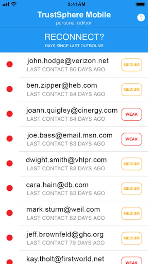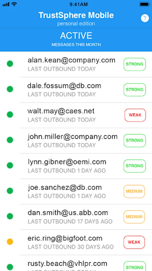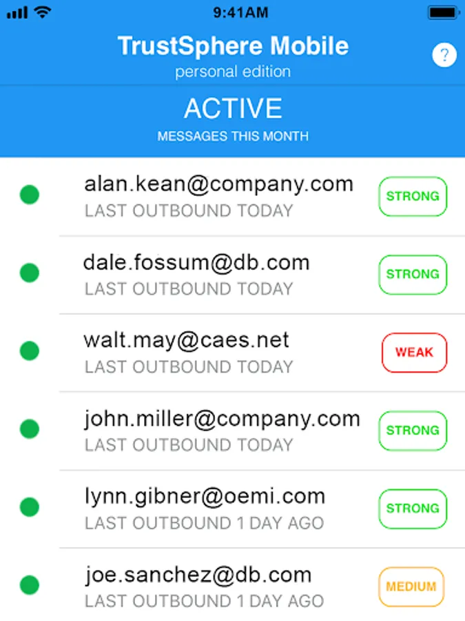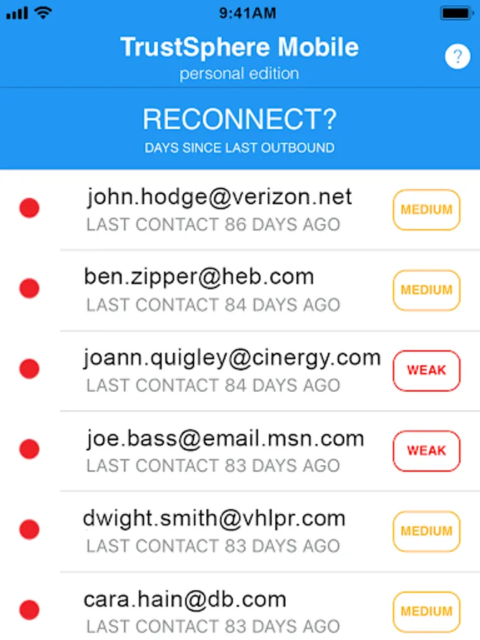 With the TrustSphere mobile app, you can see the current status of all of your key work related relationships.