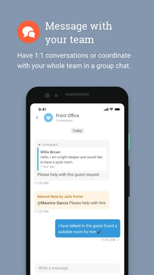 * Have 1:1 conversations or coordinate with your whole team in a group chat.