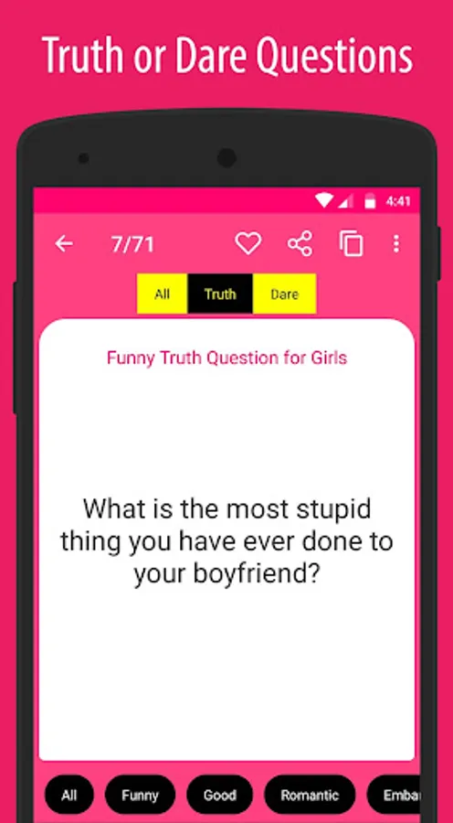 Truth Dare Questions mobile app is developed especially for providing interesting questions for playing truth or dare game. We have collected more than 800 truths and dares which you can use to make your game interesting.