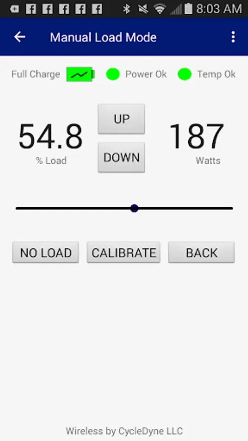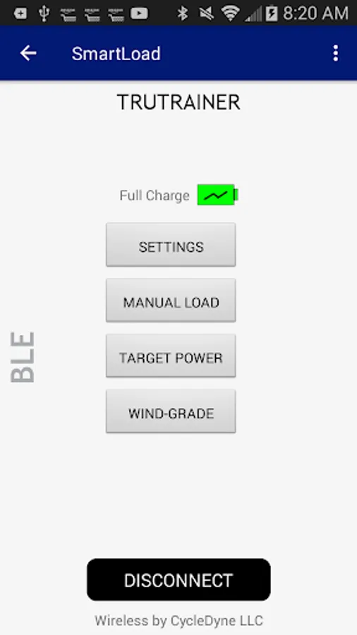 The SmartLoad app provides three modes of operation for your bicycle training needs. Manual mode allows you to easily select a percentage of maximum load that will be provided at all bike speeds. Target Power mode enables you to choose a constant wattage to be controlled to independent of bike speed or pedal cadence. Wind-Grade mode lets you select the headwind and road grade and automatically changes resistance based on your bike speed.