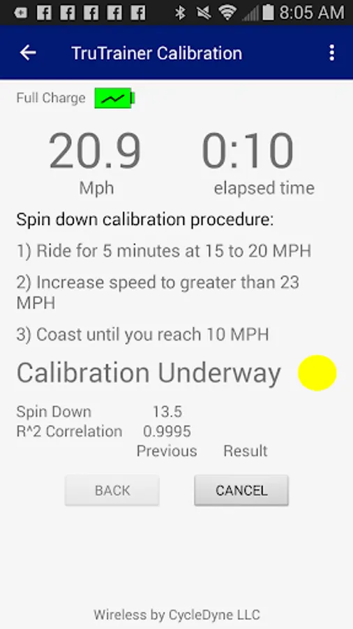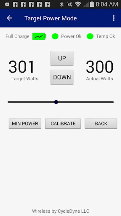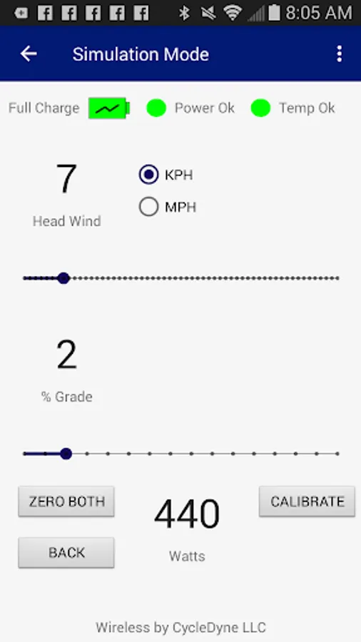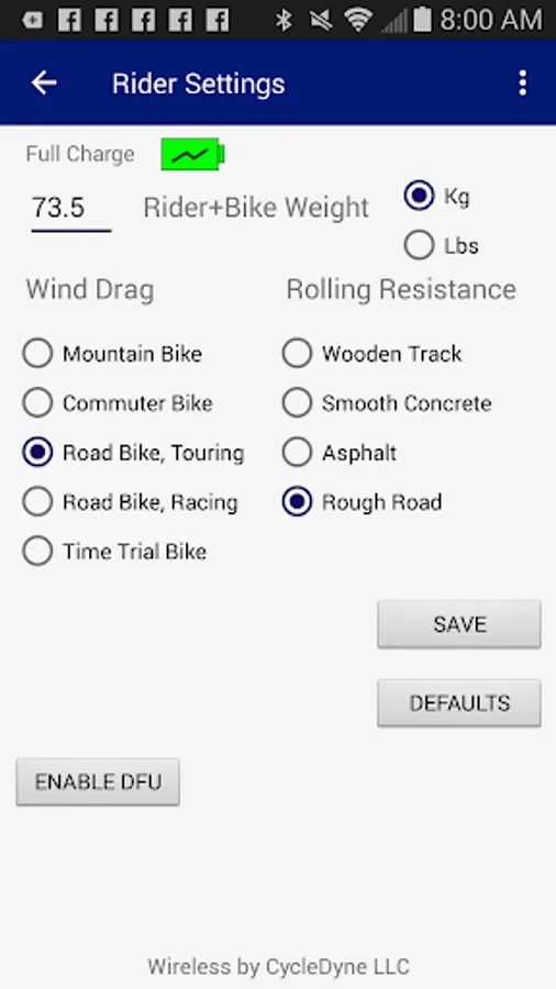 There are supplemental views that allow you to customize parameters for your bike type and weight as well as road condition. This app also provides a calibration routine to allow the system to be tuned to match your bike's parasitic load and changes in roller resistance due to environmental conditions.