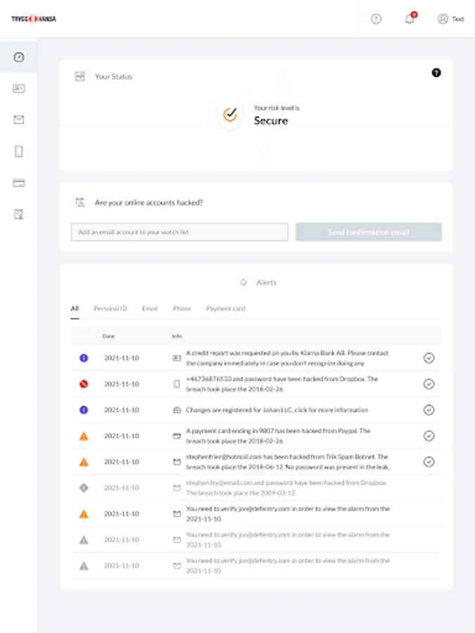 With the help of ground breaking technology and thorough analysis Trygg-Hansa ID Protect monitors your identity online around the clock, worldwide.