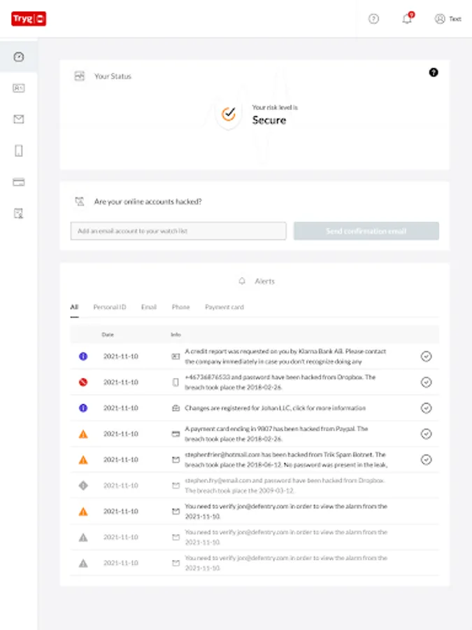 With the help of ground breaking technology and thorough analysis Tryg ID Protect monitors your identity online around the clock, worldwide.