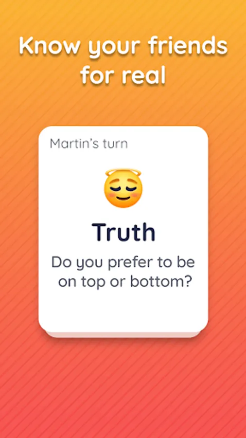 Truth or Dare is one of the best game to play in a group of couples, friends, families, and lovers. Truth or Dare is also well-known with the name "Spin the bottle" game. This is the ideal Truth or Dare for parties, dates, sleepovers, and breaking the ice.