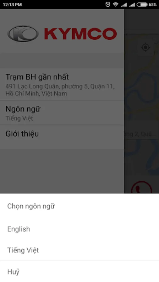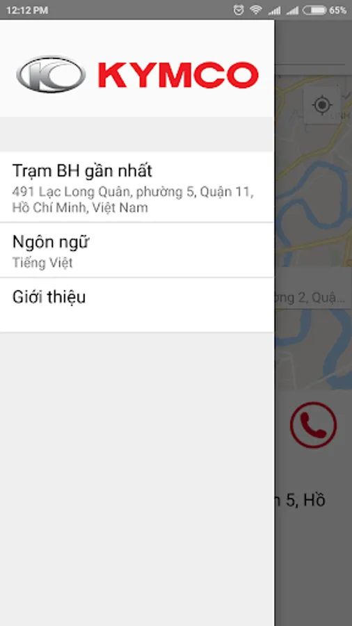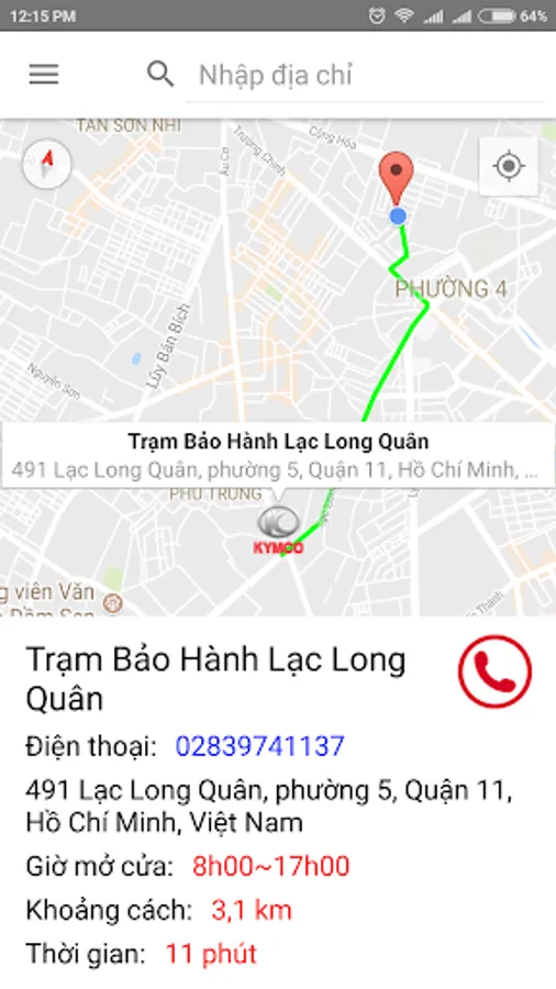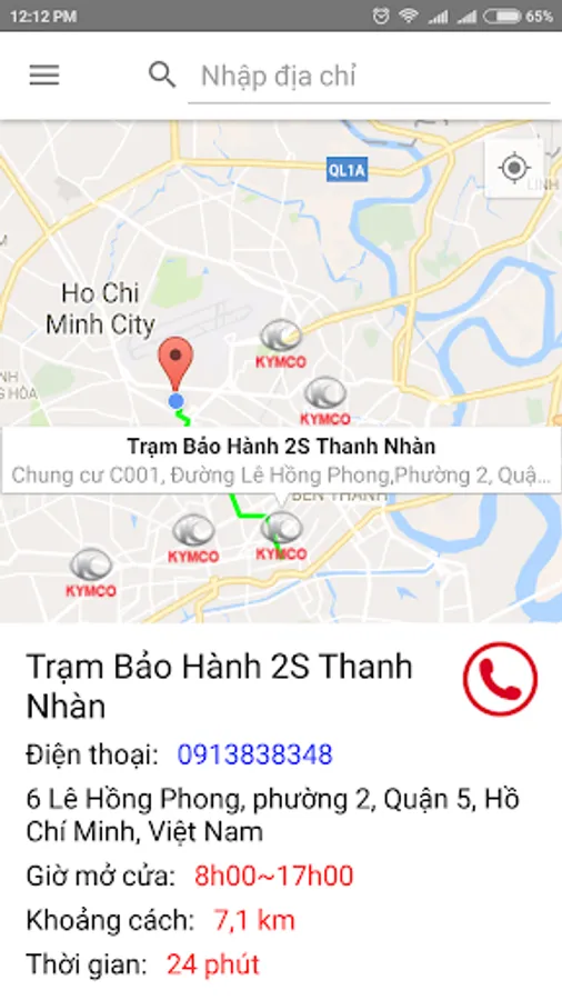 App search for stations warranty brand KYMCO vehicles, application allows fast searches warranty stations, distance, travel time to go to the station and opening hours of the maintenance station