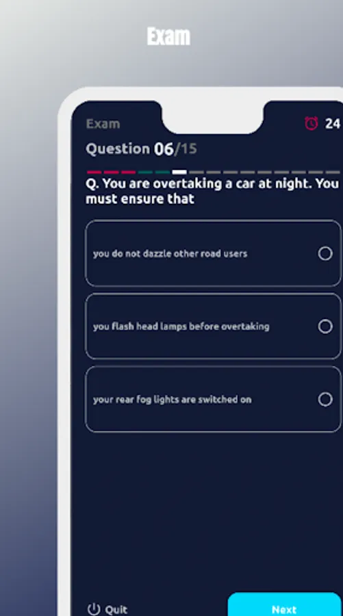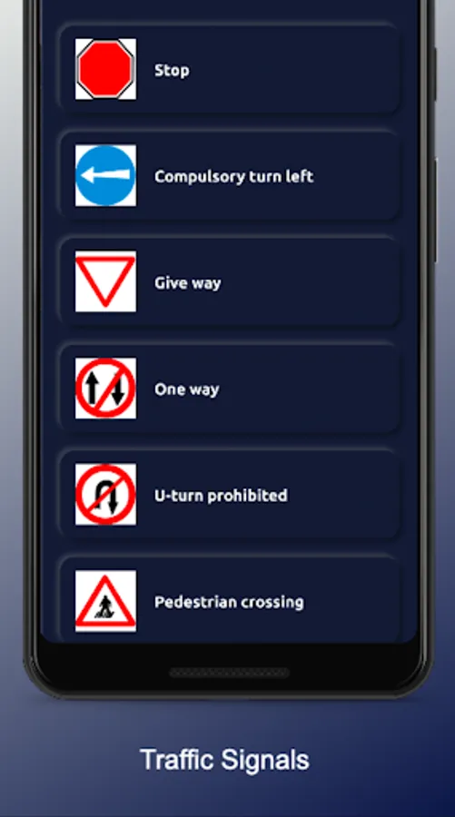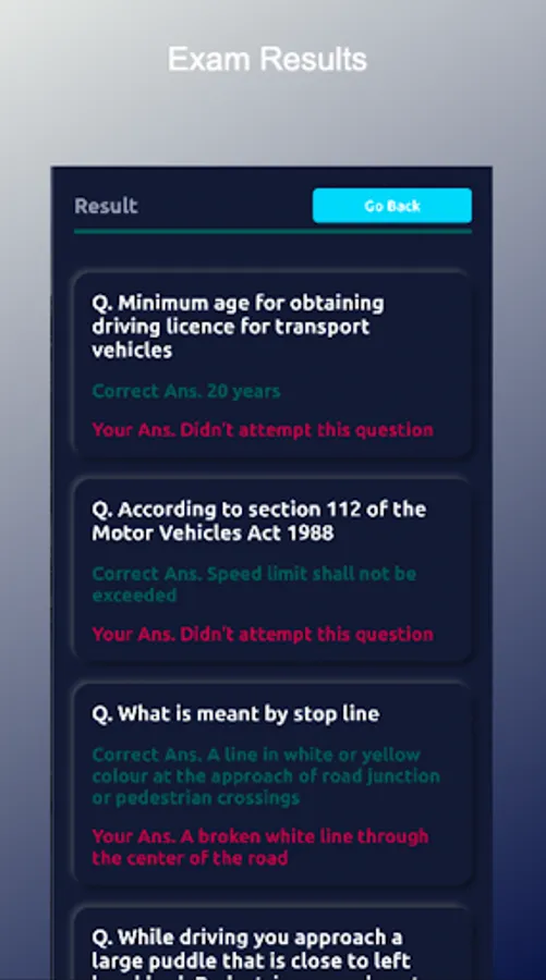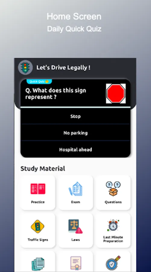 - Exam : Exactly same as RTO test, random questions and road signs related questions will be asked in this exam.Time limit for each question will be 30 seconds(Exam Mode)