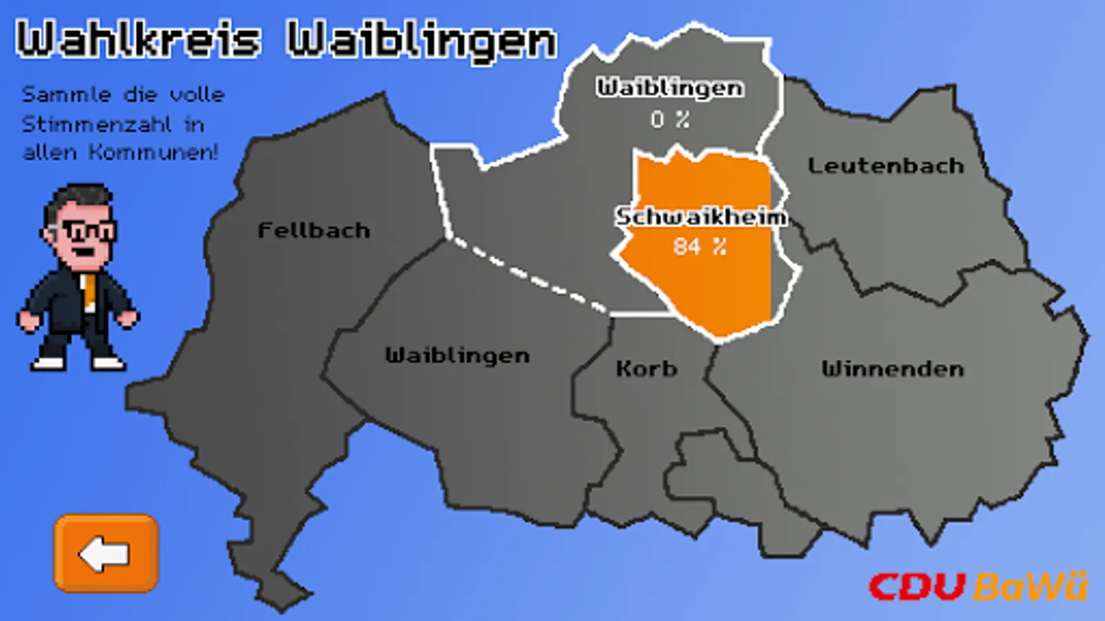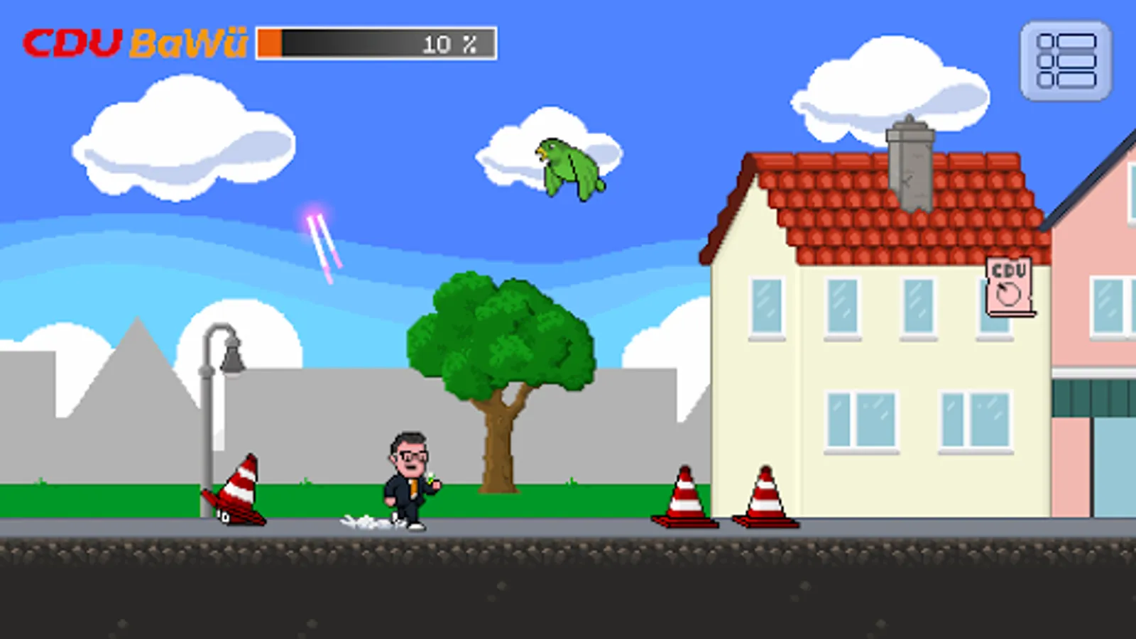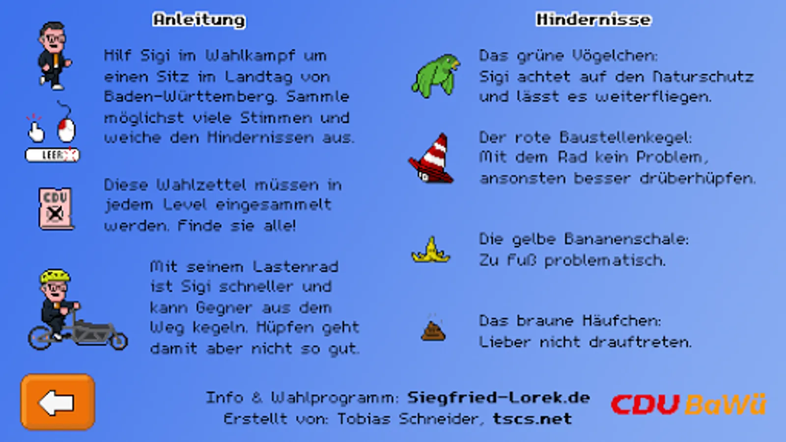With this little runner you will help Siegfried Lorek in the election campaign for a seat in the state parliament of Baden-Württemberg. To do this, collect as many ballot papers as possible for the CDU in all the communities in his constituency and overcome pits and other obstacles.