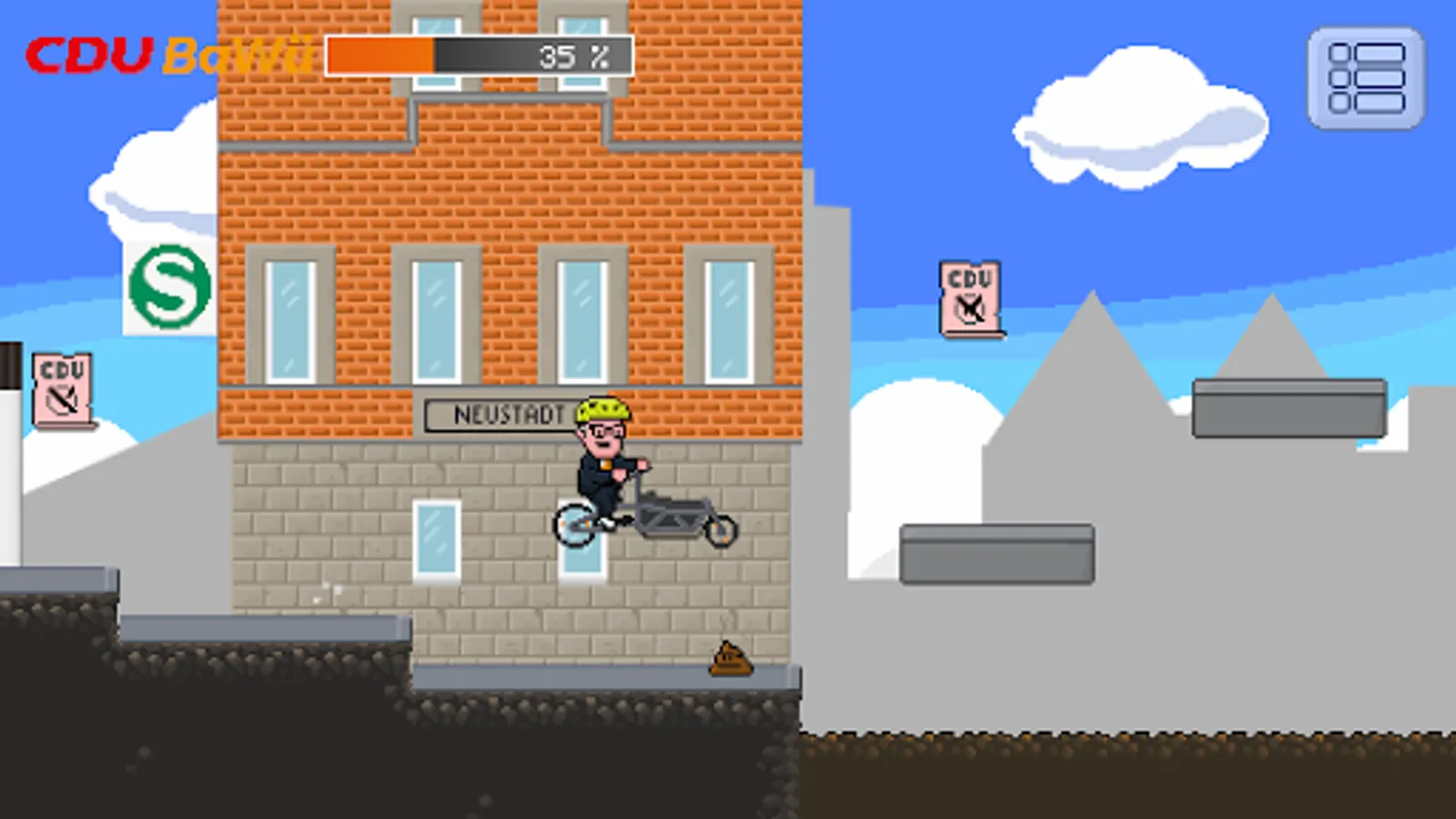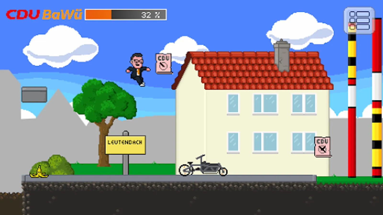 Sigi is on foot or with his cargo bike during the game and has to dodge banana peels and green birds with skilful jumps. The aim of the game is to get as many ballot papers as possible in the entire constituency. But that is not so easy...