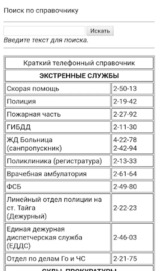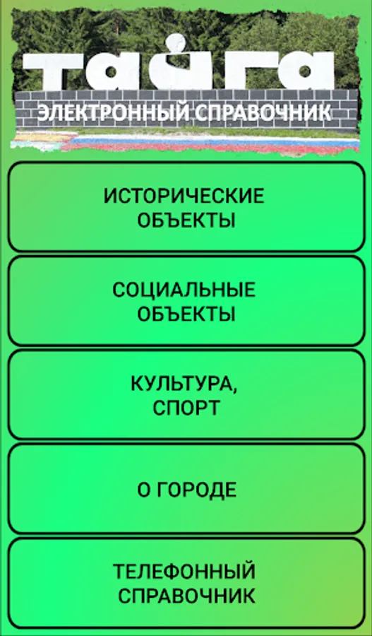 The application has a section devoted to the history of the city of Taiga. In addition, the application has a telephone directory with the current phone numbers of urban enterprises. For ease of use, a search function is implemented in the telephone directory.
