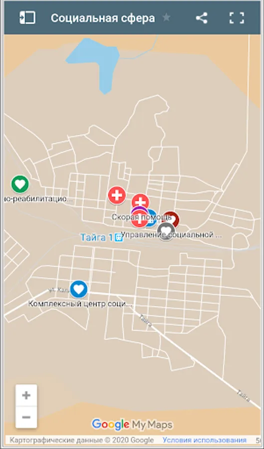 On the map "Social objects" there are objects of paramount importance - an ambulance station, a hospital, a clinic, social protection, etc. For each object, information, photographs, location, telephones and opening hours are given.