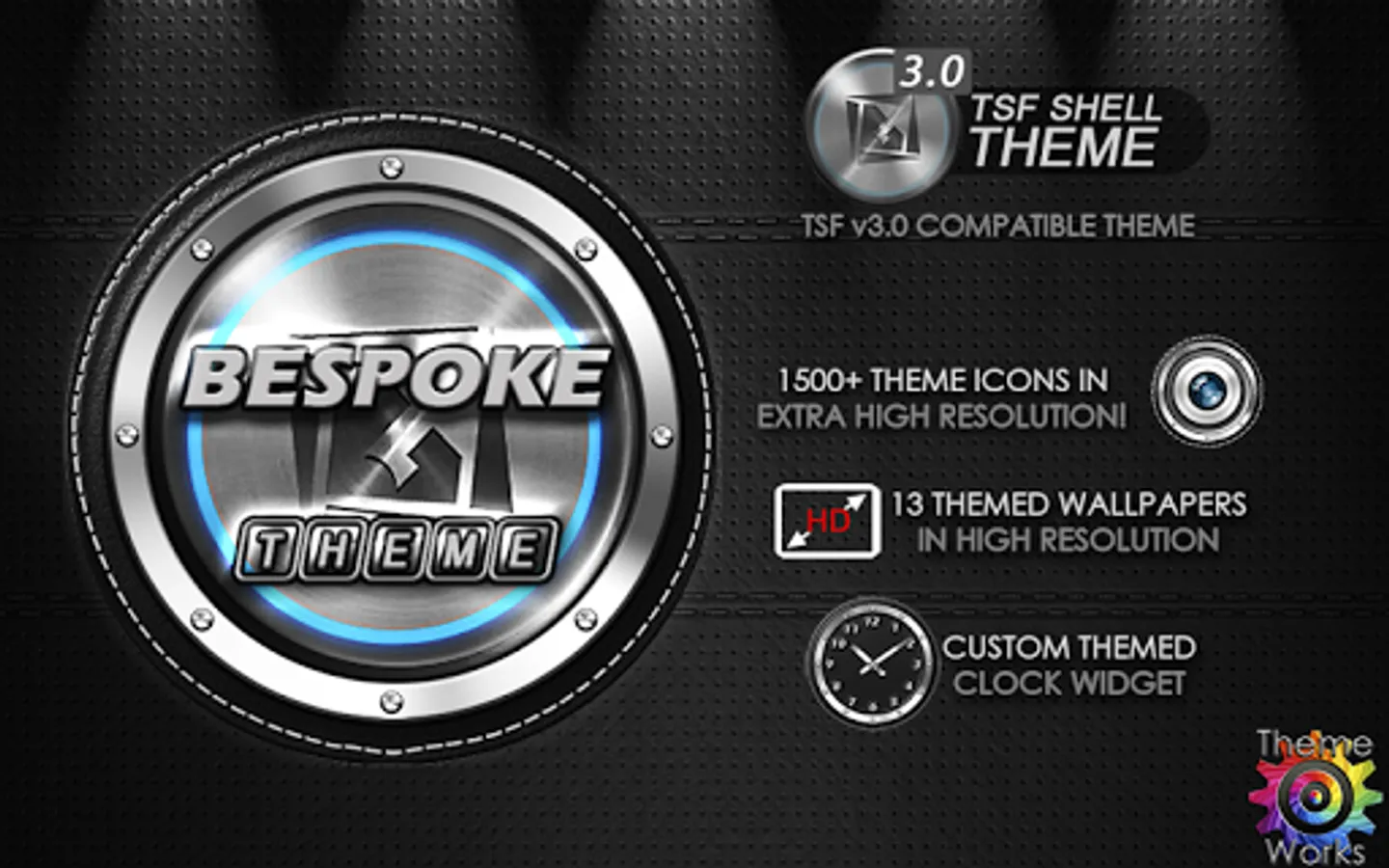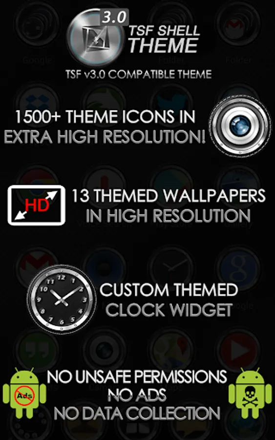 TSF launcher theme compatible with latest TSF Shell version. Extremely detailed and high quality elegant and modern TSF Shell theme with high definition graphics including a 1500 pack of HD icons, 13 custom themed HD wallpapers, and a themed clock widget, to give very detailed and defined graphics even in devices with the highest resolution screens. Everything is themed to the last detail, using metallic textures, lighting effects, reflections and gradients to give a great contrast and quality look.