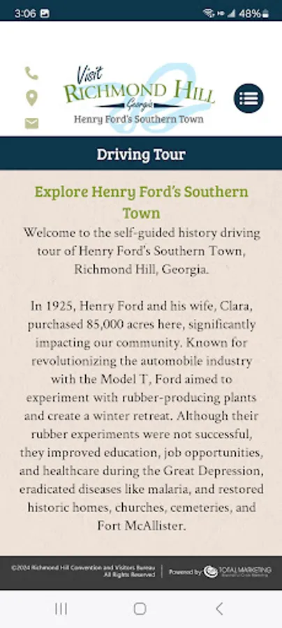 Take a spin through Henry Ford’s Southern Town, just minutes from Savannah! The app guides you along a historical tour of the Coastal Bryan Heritage Trail, detailing the history of Richmond Hill, Georgia, from colonial days to the 20th century when auto magnate Henry Ford and his wife, Clara, made the area their Southern home. Users can access maps for directions to each destination and learn about the locations through detailed descriptions and website links. In addition to historical sites, the app includes information on lodging, shopping, dining, and more. The historical tour includes both interpretive text and audio narration, enhancing the Richmond Hill experience with every mile.