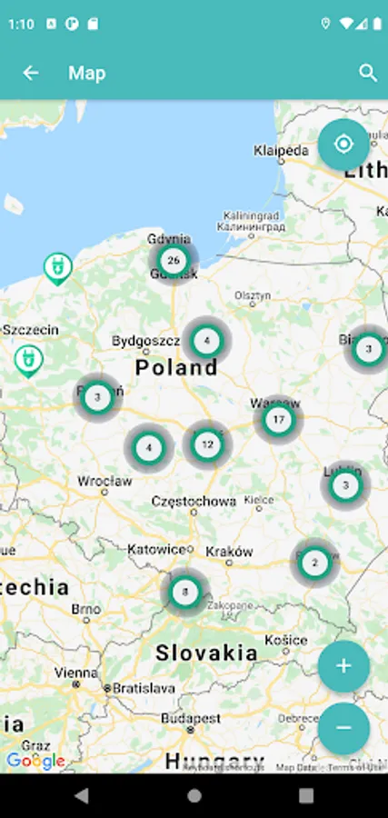 The application allows you to search for nearby charging stations. You can also search by city, zip code or charging station number. The search list shows an overview of the available charging stations and the distance to them.