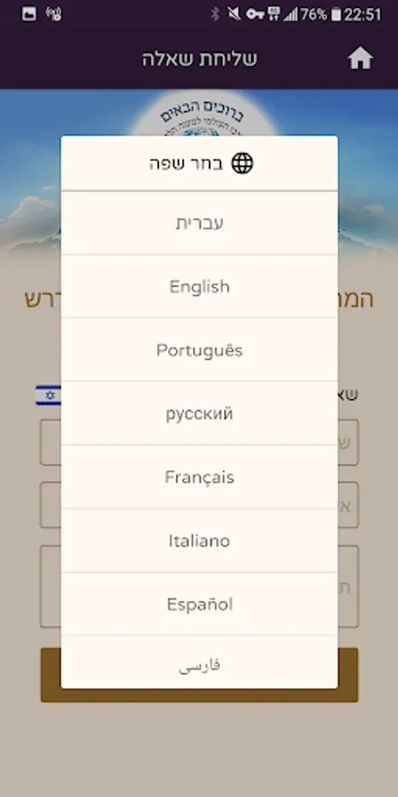 (Hebrew, English, French, Spanish, Portuguese, Italian, Russian, Yiddish, Arabic, Persian)