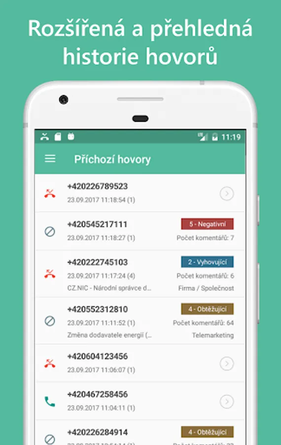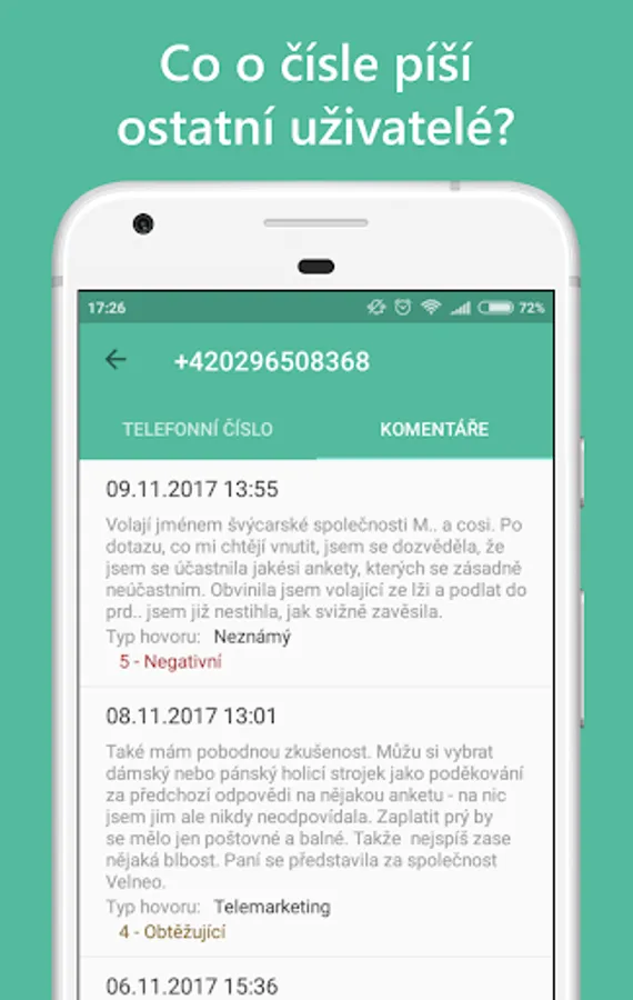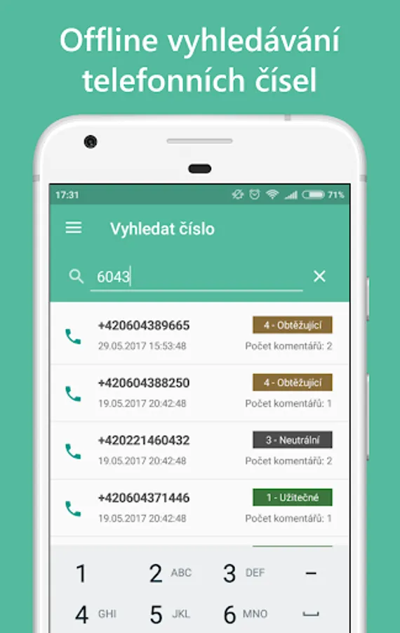 ✔ for each telephone number it is possible to display a detail with information and ratings from the database, including user comments