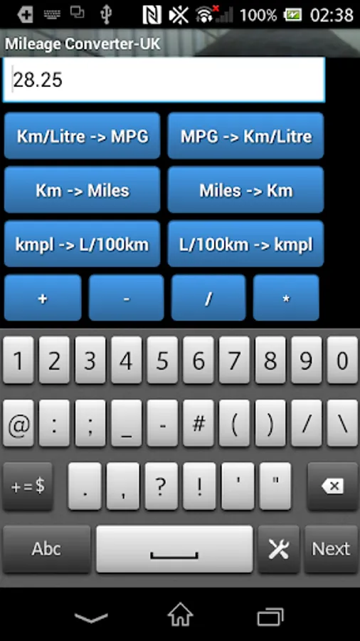 A simple, fast and free mileage converter; It converts from MPG to KMPL and Miles to Kilometres and vice-versa. It also converts Lts/100km to km/lt.