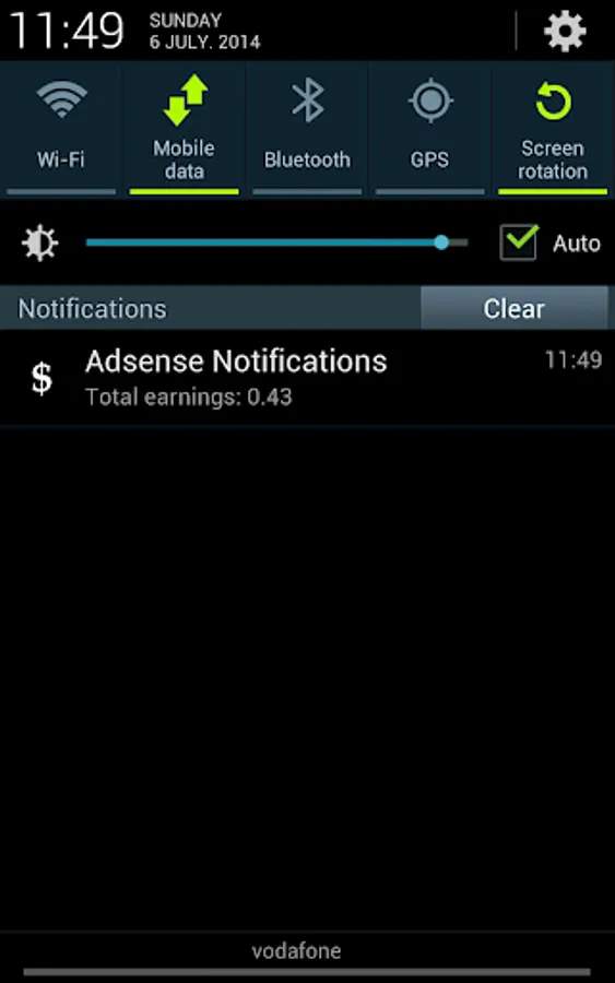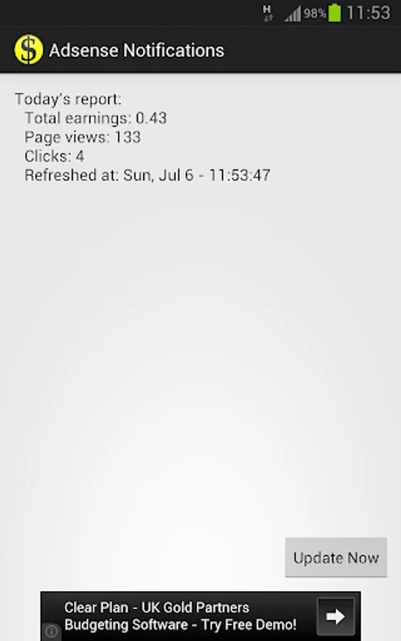 This app runs a background process that fetches your earnings for today from your Google Adsense account every 15 minutes. Data connection or WiFi should be enabled in order for the app to reach your Google Adsense account.