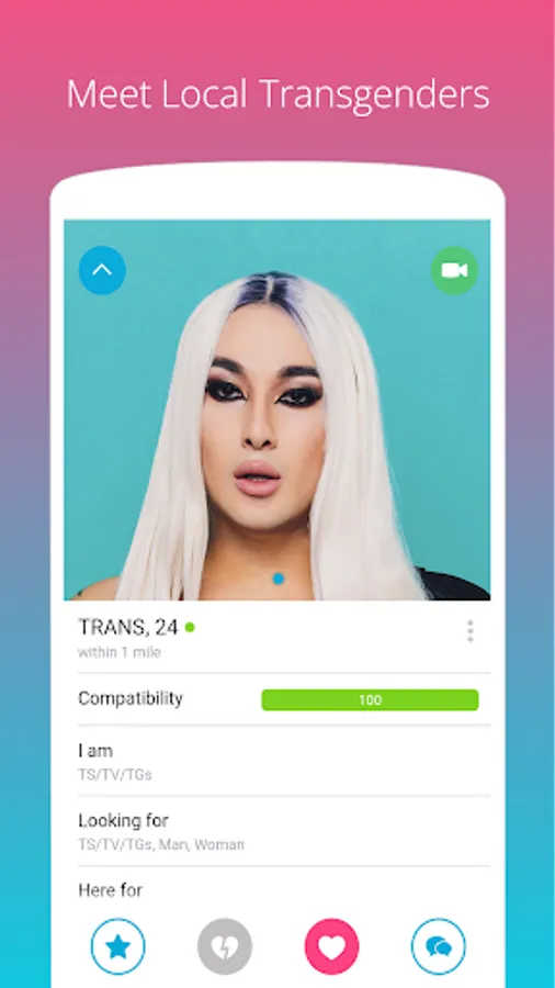 TSMeet is the online dating app for all the transgender women and men chat, meet & date, and it's also one of a best app for all the MTF & FTM transsexuals, transvestites, crossdresser, sissies, female impersonators, male impersonators and everyone else who are interested in the transgender dating. No matter you are trans or not, here you can be yourself, you can find friend, love, a long-term relationship and even the marriage.