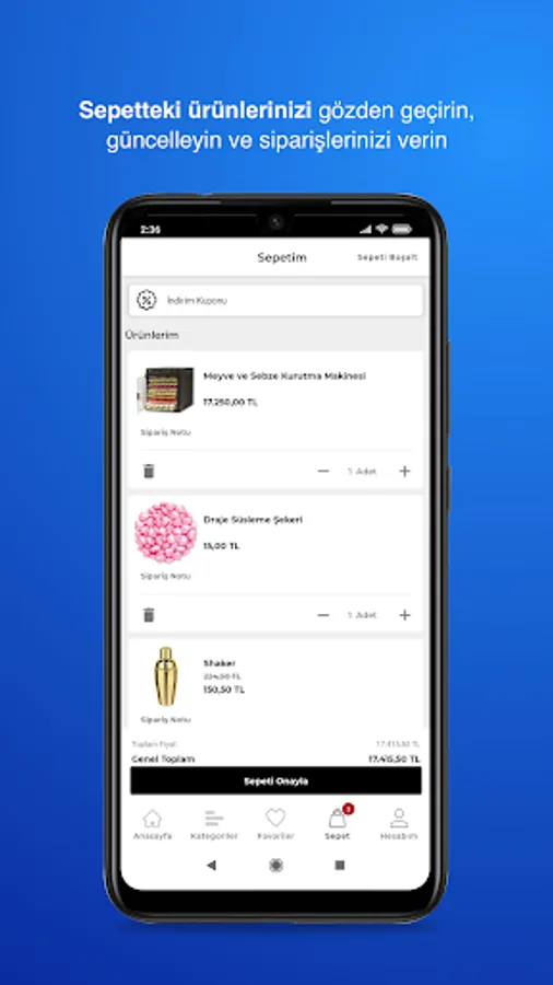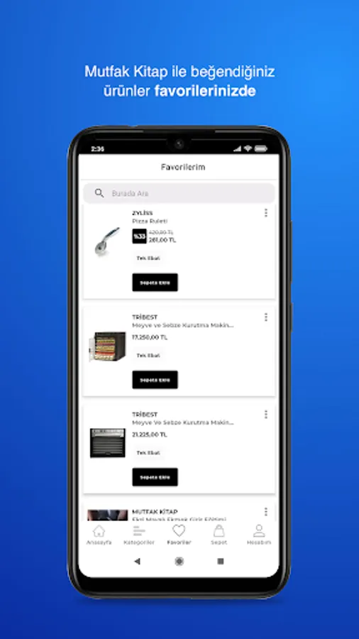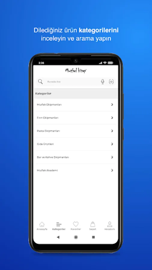 * 5000 kinds of products and equipment for the bakery, bread, cake, cafe, hotel and kitchen sectors are in the Mutfakkitap Mobile application. * Kitchen, bakery, cake, bar and coffee supplies on your phone with one click. With the MutfakBook Mobile application; * It is now very easy to make your life easier with all the products you need such as small household appliances, kitchen utensils, industrial products and machines, cake and bakery utensils. *Start using the application right now and don't miss out on special discounts and campaign opportunities! It is very easy to shop with Mutfakkitap Mobile! * Thanks to its advanced search, sorting and filtering features, you can easily find the products you are looking for, create a fast order and track the status of your order. With Kitchenbook Mobile; *You can create your favorite product lists and buy them later. * You can be informed about current campaigns and announcements by opening your notifications. *You can review our special product recommendations. *You can easily enlarge and examine the product images in detail. * You can easily find the products you are looking for, create an order and track your cargo. *You can shop within seconds by logging in once. * You can quickly log in via your Google and Facebook accounts.