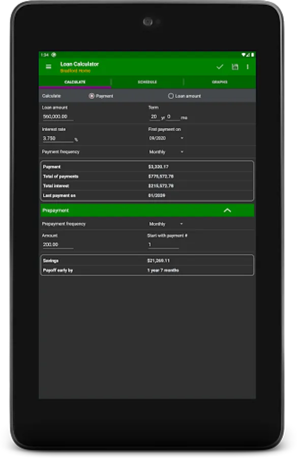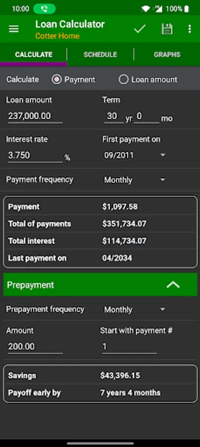 2. When extra payment is made, Loan Calculator calculates savings and how earlier the loan is paid off. Extra payment can be done one-time, bi-weekly, monthly, quarterly, semi-annually or annually.