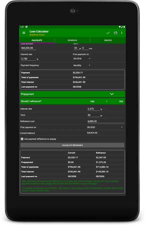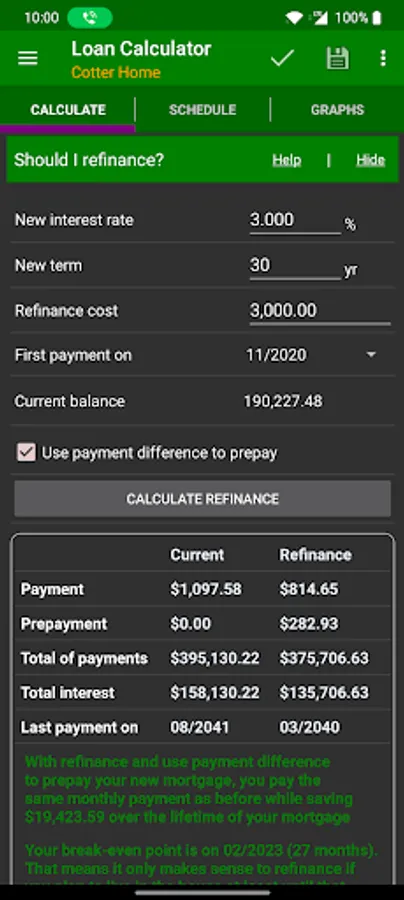 3. Refinance feature lets you quickly find out whether or not you should refinance your current loan to lower your monthly payment and pay off the loan early.