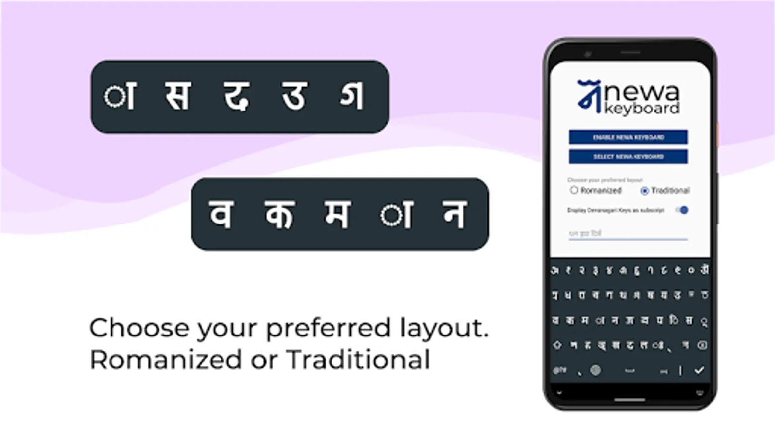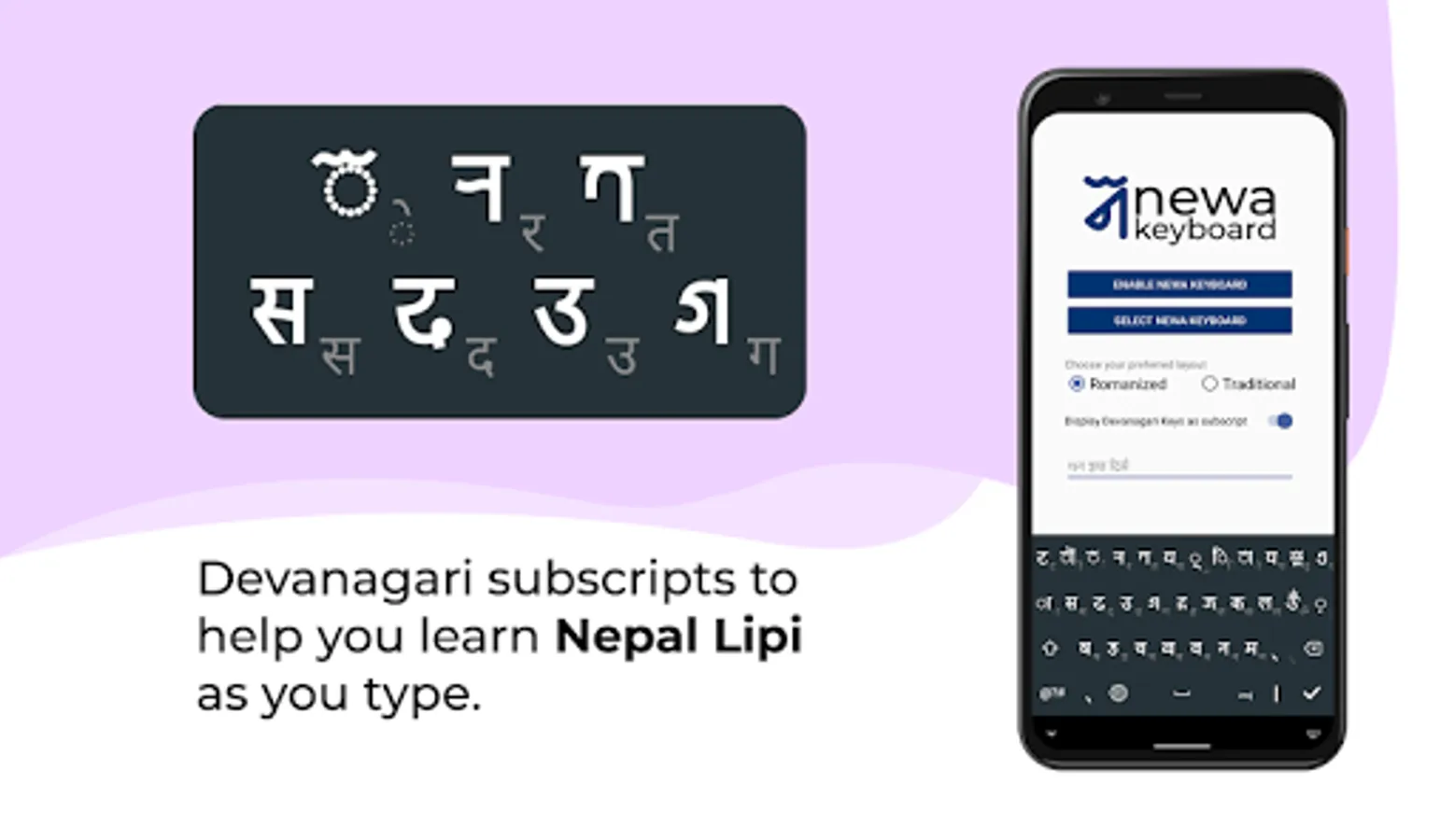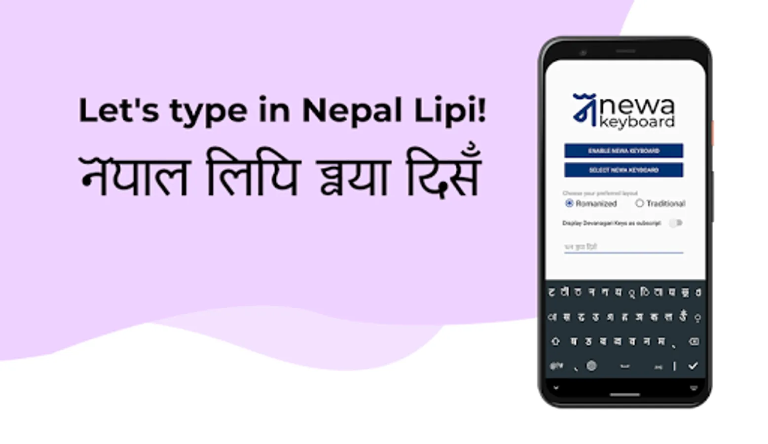 Newa Keyboard let's you type in Nepal Lipi (or also known as Prachalit Nepal Lipi). With Newa Keyboard you can type in Nepal Lipi in any app in your phone.
