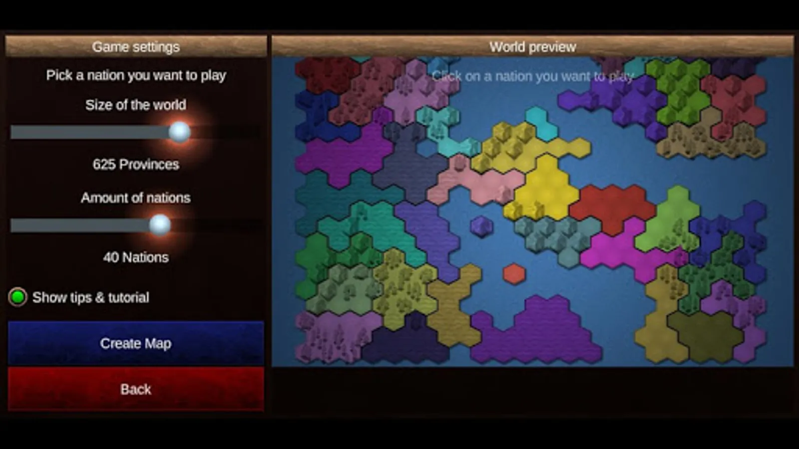 Playable scenarios: Randomly generated map with adjustable size, Africa, American continent, Asia, Europe, Europe (1936)