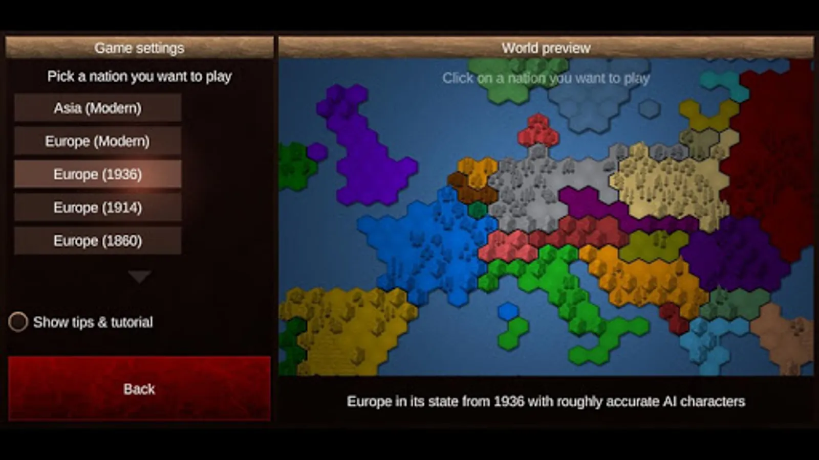 Playable scenarios: Randomly generated map with adjustable size, Africa, American continent, Asia, Europe, Europe (1936)